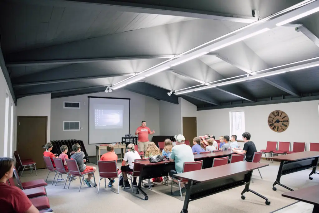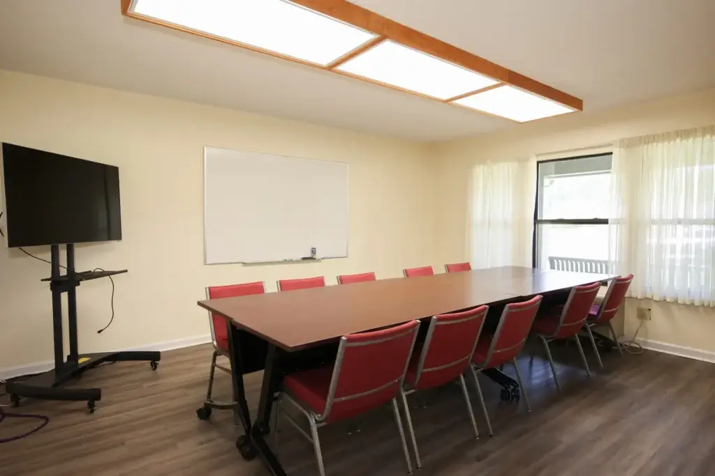 - Located in the Lodge, our Conference room is equipped with meeting tables, a whiteboard, and a smart TV with a DVD player.