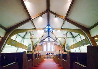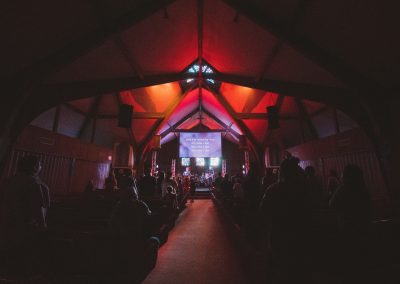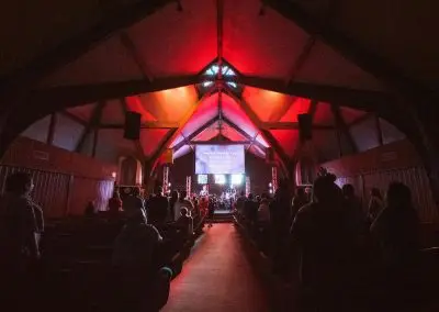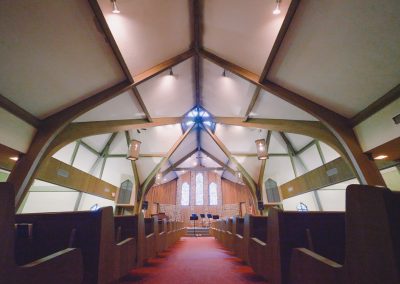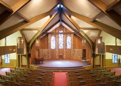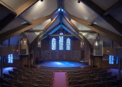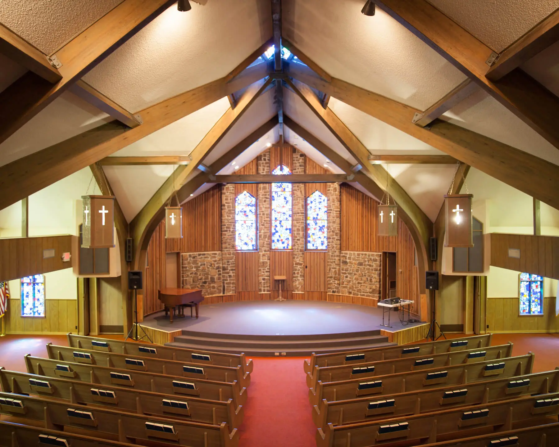 The following items are available for use: a piano, an organ, 2 podiums, a drop-down projector screen, a mounted projector, 1 sound mixing board, 2 speakers on stands, 4 microphones, 3 microphone stands, and 3 microphone cords.