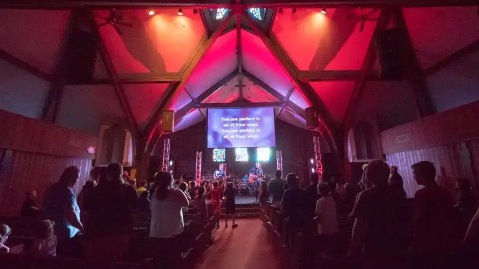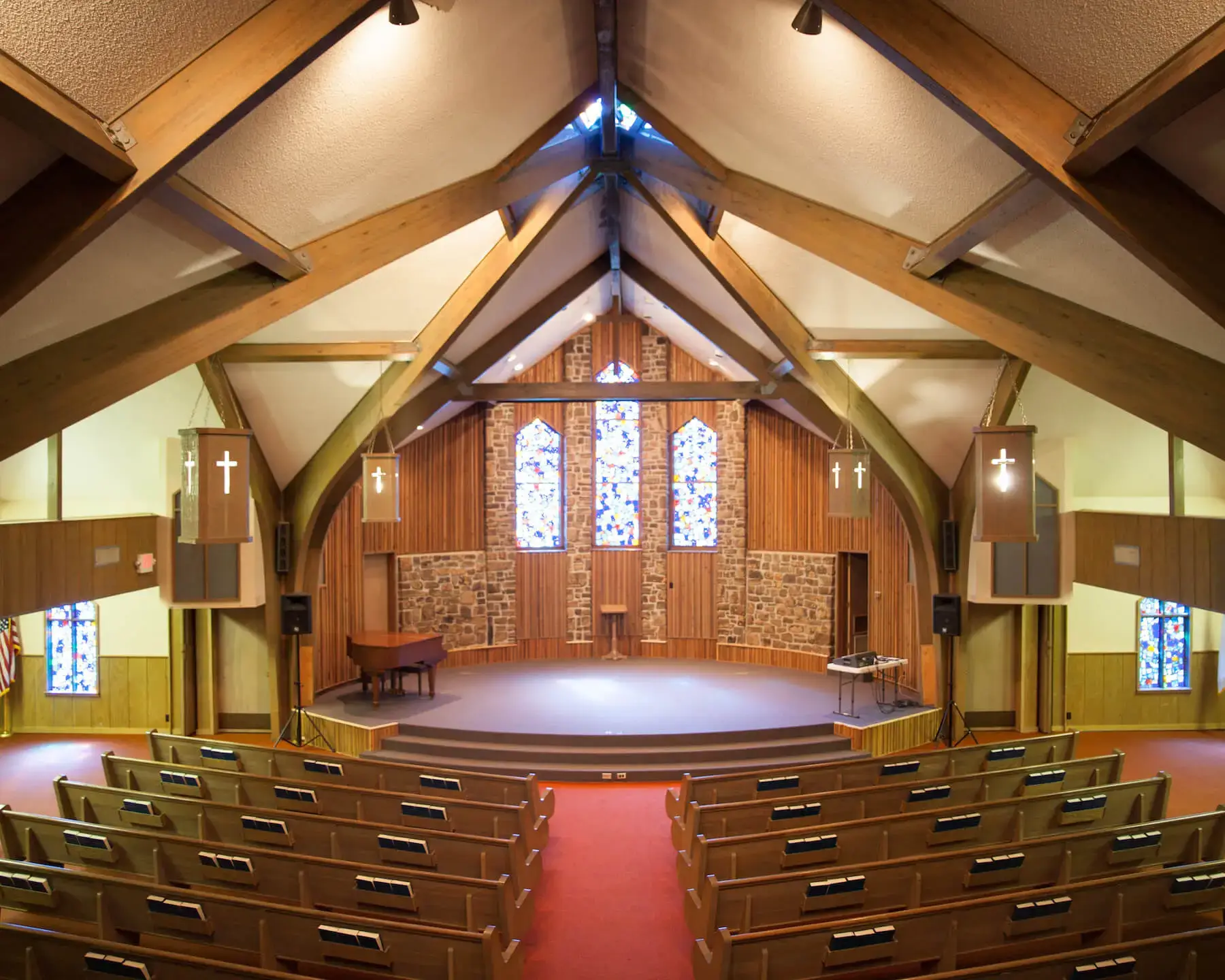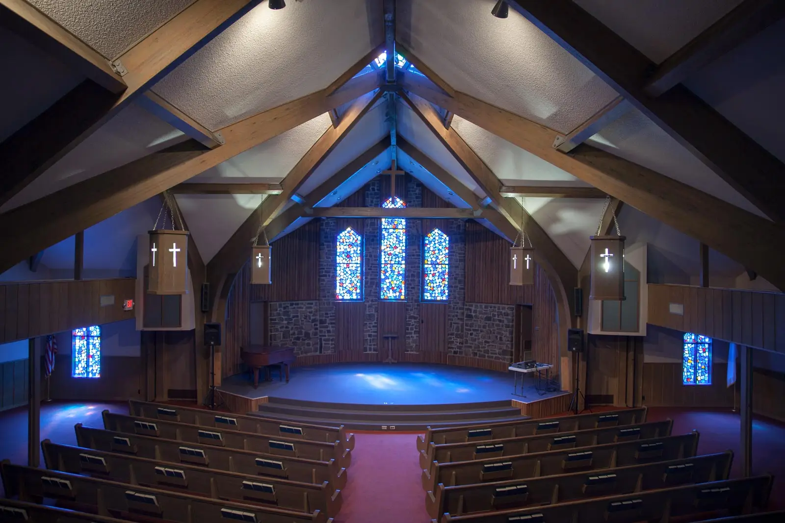 - The following items are available for use: a piano, an organ, 2 podiums, a drop-down projector screen, a mounted projector, 1 sound mixing board, 2 speakers on stands, 4 microphones, 3 microphone stands, and 3 microphone cords.