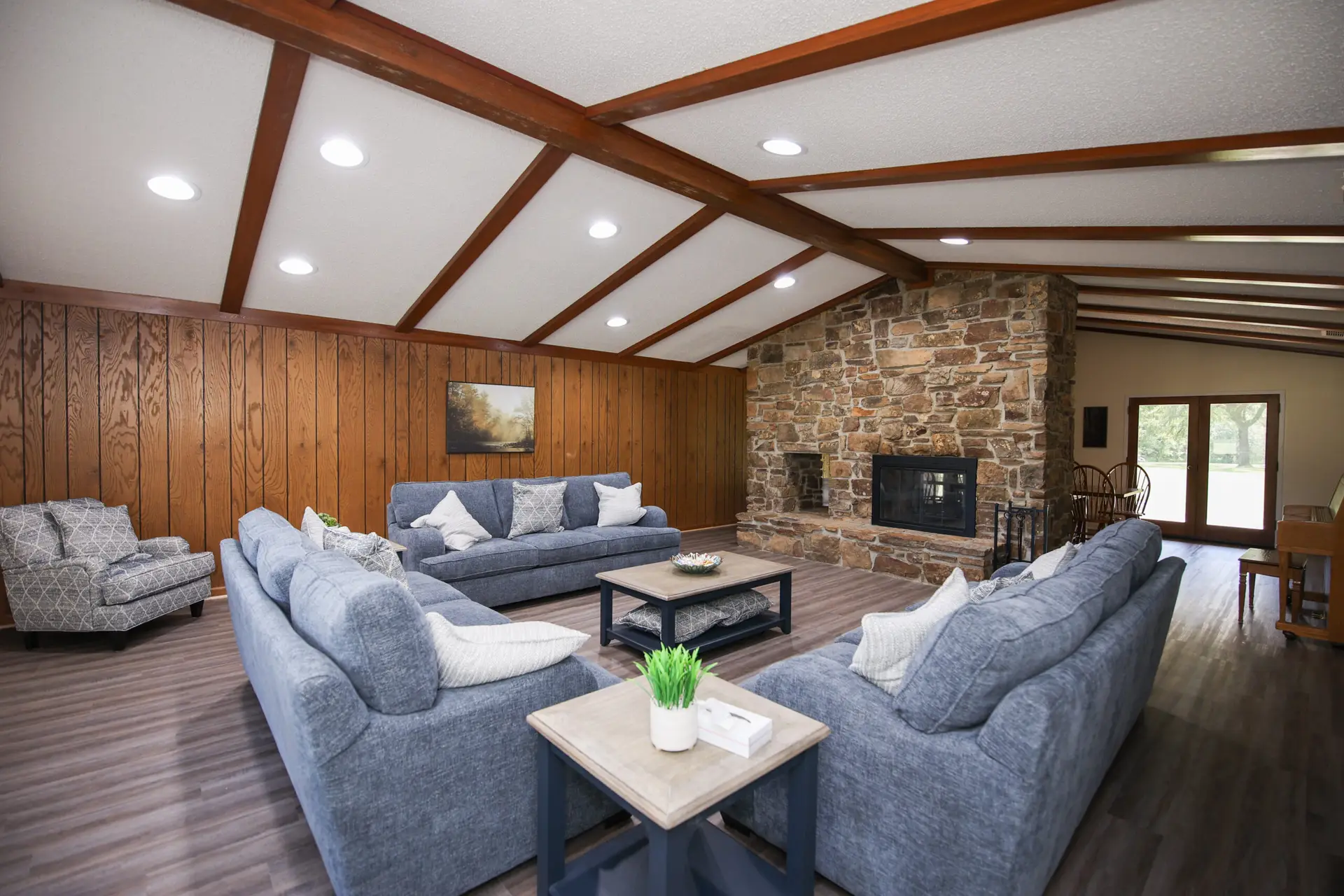 - The great room is furnished with a sofa, four large chairs, a piano, and a television with DVD player.