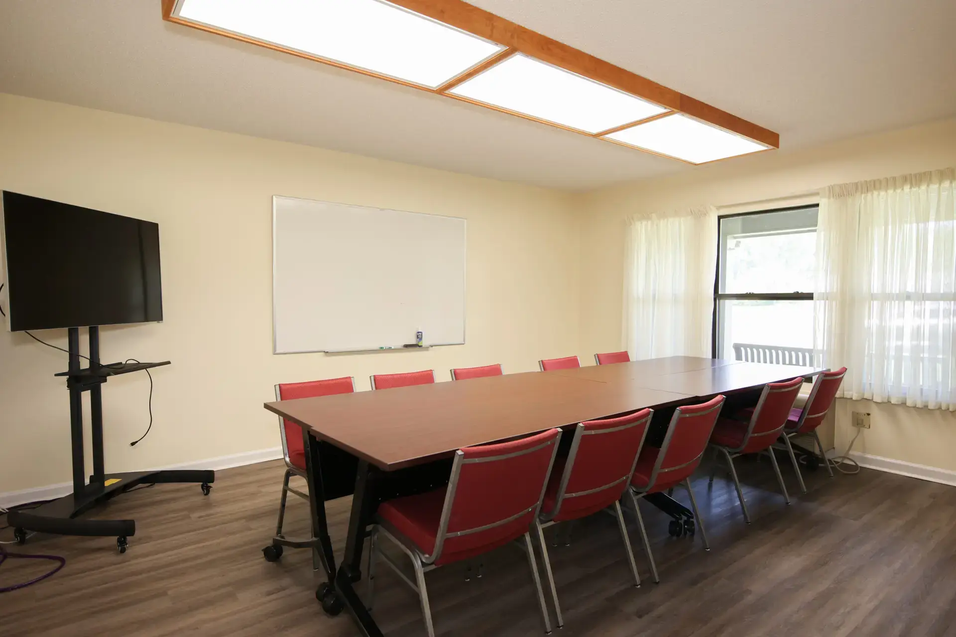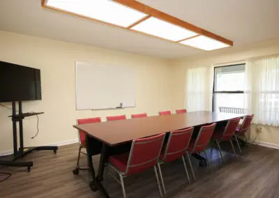 - There is a conference room with (4) rolling tables, (ten) chairs, a whiteboard, and a smart TV with DVD player.