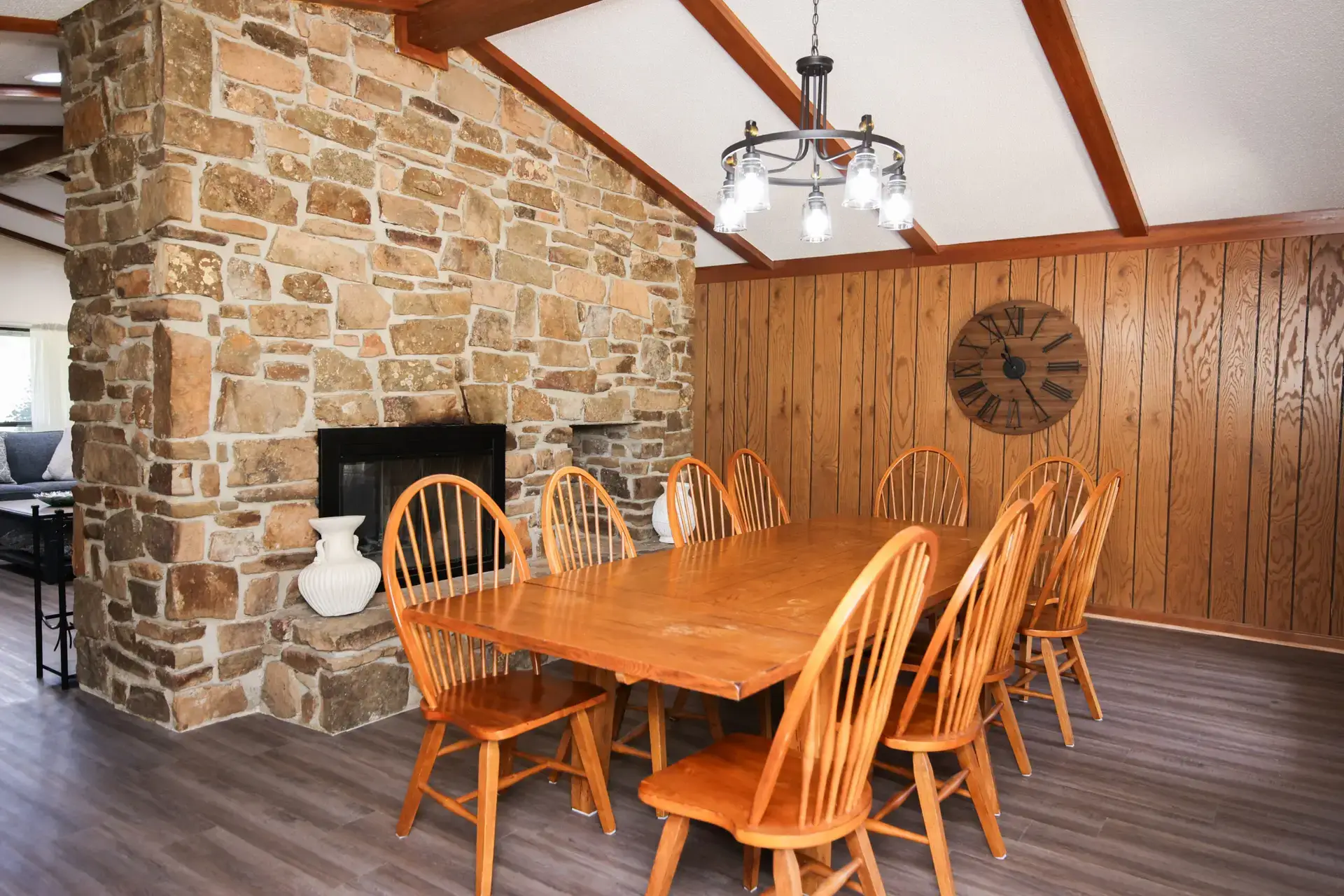 - In the dining room there is a large table and ten chairs.